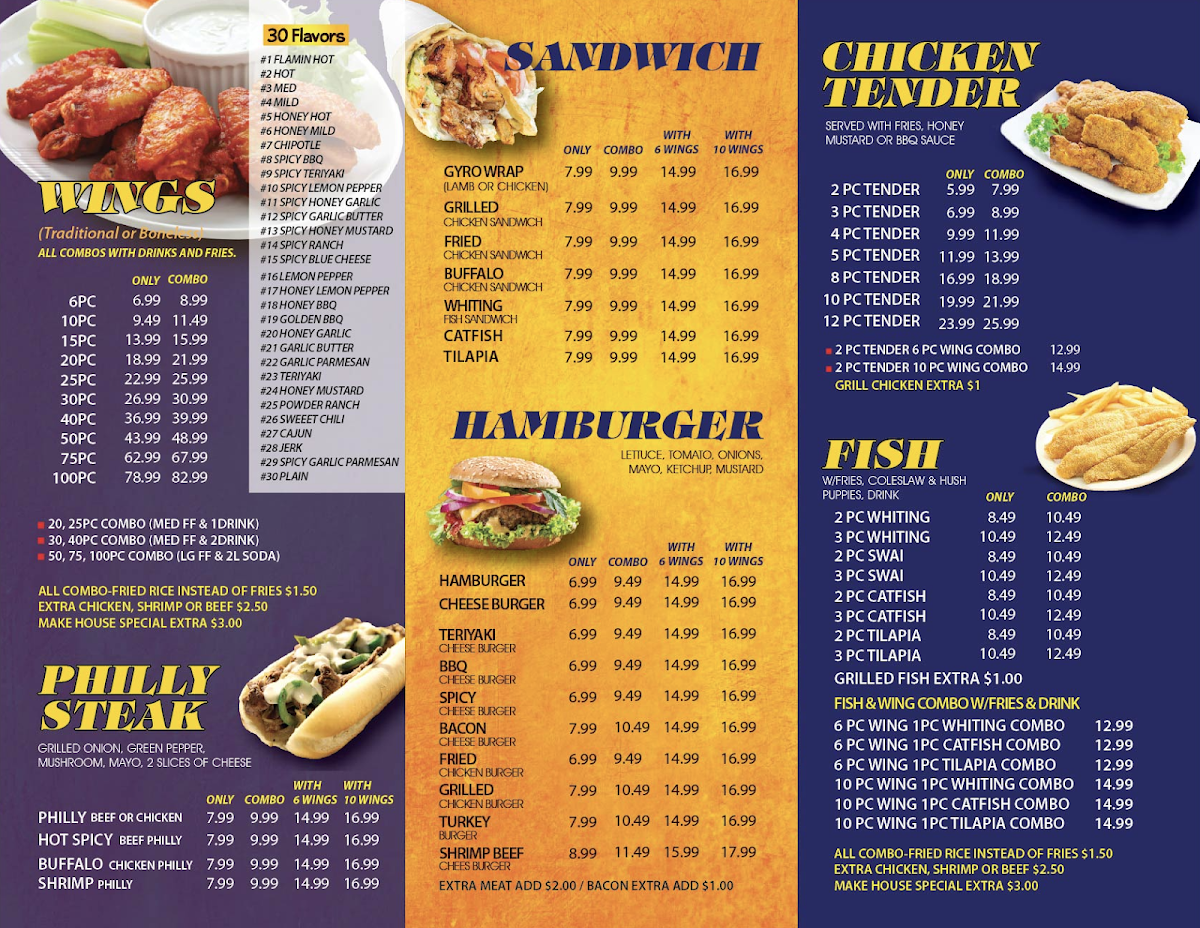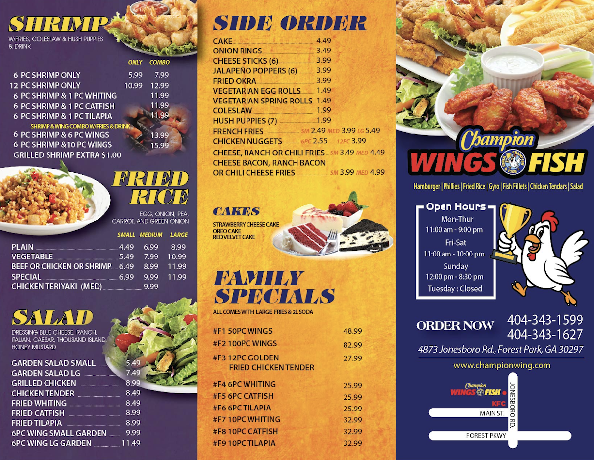 From a reviewer’s perspective, the menu at Champion Wings And Fish Forest Park offers a satisfying variety that leans heavily into hearty, comfort-style favorites. The Fried Rice section includes options like Vegetable Rice, Shrimp Fried Rice, Chicken Fried Rice, Special Fried Rice, and Beef Fried Rice, giving diners flexible choices to match their preferences. Their combo offerings stand out, especially the Fish & Wings Combo with Fries & Drink, featuring combinations such as Wing (6 Pieces) Tilapia Combo (1 Piece) or Wing (10 Pieces) Catfish Combo (1 Piece), which are great value for those wanting a bit of everything. The Chicken Tender selections-ranging from Tender (3 Pieces) to Tender (10 Pieces)-are perfect for quick bites or sharing. Seafood lovers can enjoy items like Catfish (2 Pieces), Tilapia (3 Pieces), and Shrimp (12 Pieces) under the Fish & Shrimp section. Meanwhile, the Philly Steak lineup, including Philly Steak Combo and Philly Chicken Combo, adds a savory sandwich option. Sides such as French Fries With Cheese & Bacon and Cheese Stick (6 Pieces) complement the mains nicely. The menu also expands into wraps and burgers, with items like Gyro Lamb Only, Chicken Gyro (Combo), and Grilled Chicken Burger (Combo), along with fresh options like Grilled Chicken Salad (Large). For wing enthusiasts, portions like 40 Pieces (Only) or 75 Pieces (Combo) make it ideal for groups. Overall, while prices aren’t listed, the wide selection and combination meals suggest a menu designed for both value and variety.